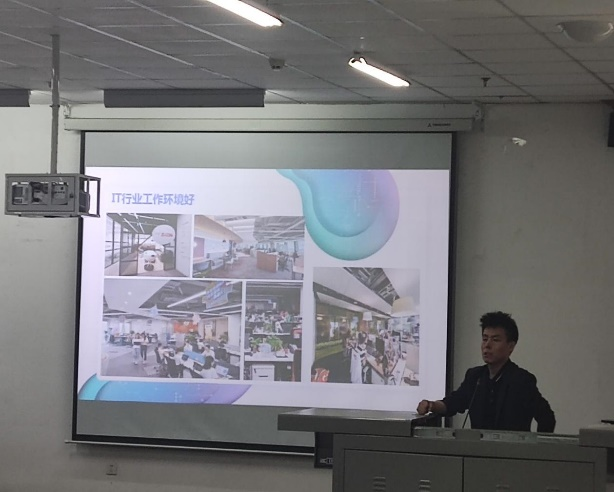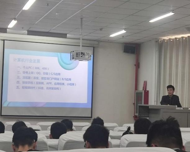 本次讲座由软赢科技邵老师致辞,高学斌总监用轻松幽默的话语展开了此次宣讲。首先向同学们讲述了计算机行业发展的六个方向:个人PC、拨号上网、浏览器、智能手机、短视频时代和新基建。紧接着说明了IT行业可以作为我们职业第一选择的原因,新基建——风口行业人才需求大;工资待遇高——平均薪酬10K以上;职业发展潜力大——三年薪资翻翻;工作环境好——白领等等。