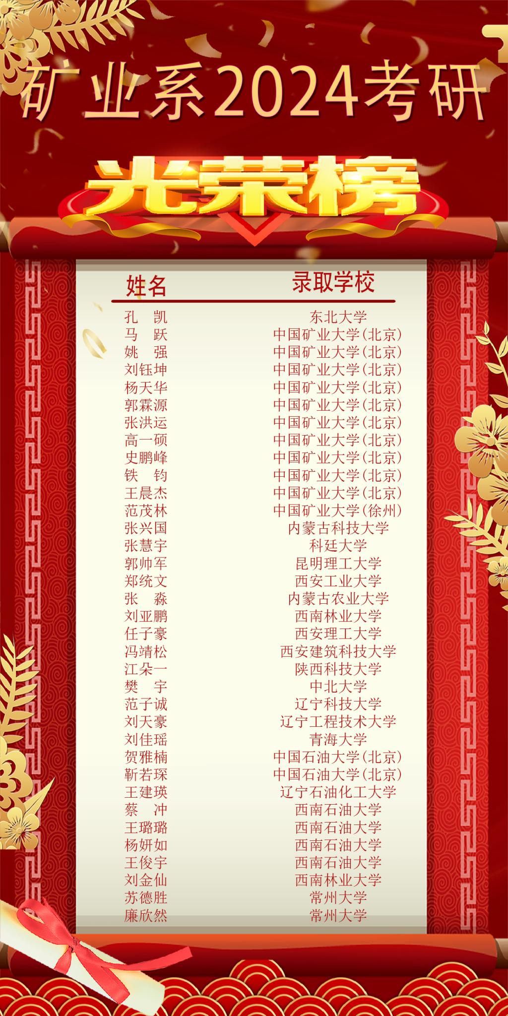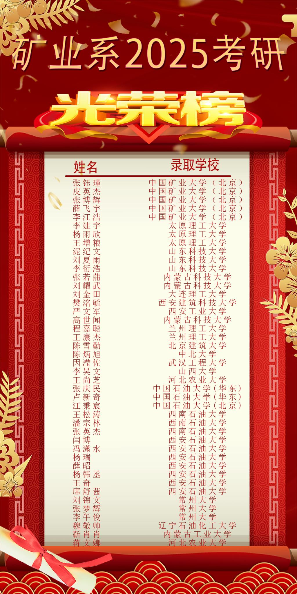 砥砺耕耘结硕果,勇攀“研”峰创辉煌!在2025年考研征程中,我系学子以不懈奋斗交出了耀眼答卷!43名学子成功上岸,用实力续写矿业人的卓越篇章!