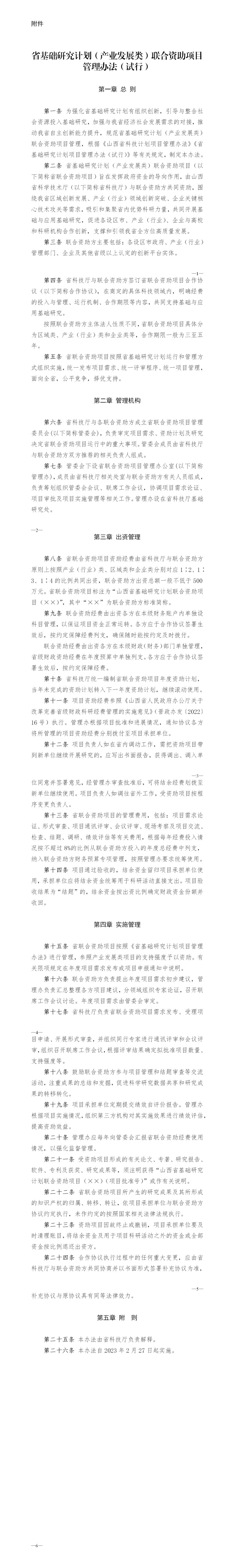 山西省科学技术厅已于2023年2月27日会议审议通过了《省基础研究计划(产业发展类)联合资助项目管理办法(试行)》,具体如下,请遵照执行。