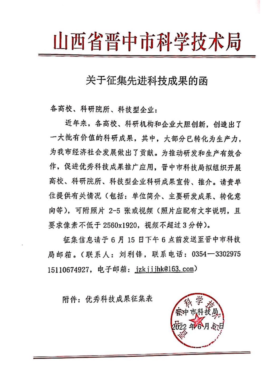 晋中市科技局拟组织开展高校、科研院所、科技型企业科研成果宣传、推介。请有意向的老师于