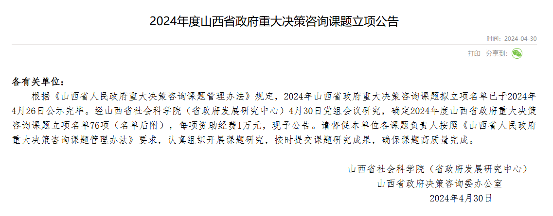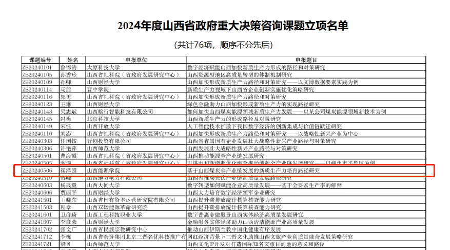 近日,山西省社会科学院(省政府发展研究中心)山西省政府决策咨询委办公室发布了2024年度山西省政府重大决策咨询课题立项公告,全省共76个项目立项。bat365官网崔泽园副教授主持的《基于山西煤炭全产业链发展的新质生产力培育路径研究》获批立项。