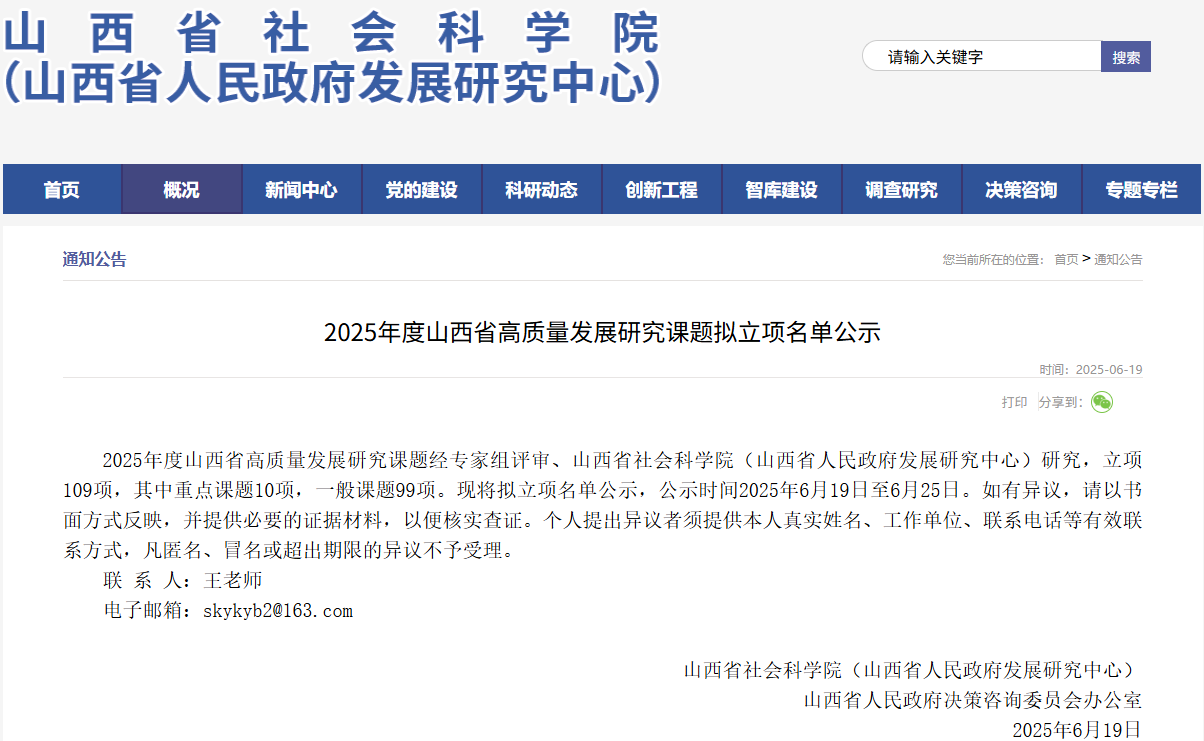 6月19日,山西省社会科学院(山西省人民政府发展研究中心)、山西省人民政府决策咨询委员会办公室发布了“2025年度山西省高质量发展研究课题拟立项名单公示”,bat365官网获批2项。