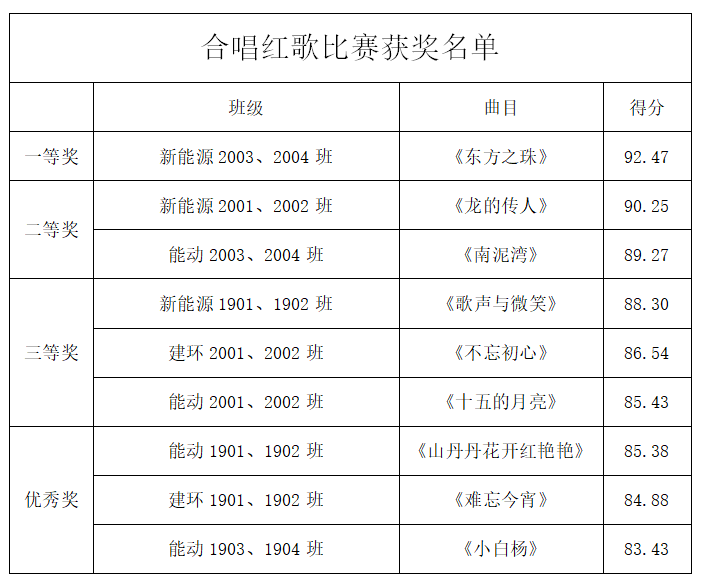 活动中,各班同学们都积极参与,歌唱红歌,展现出了青年学子的斗志与情怀,唱出了青春的旋律,唱出了我们的爱国情怀!我们本着公平、公开、公正的原则举办了本次红歌大赛,并综合评委老师评分及同学们线上投票情况,本次红歌大赛结果如下: