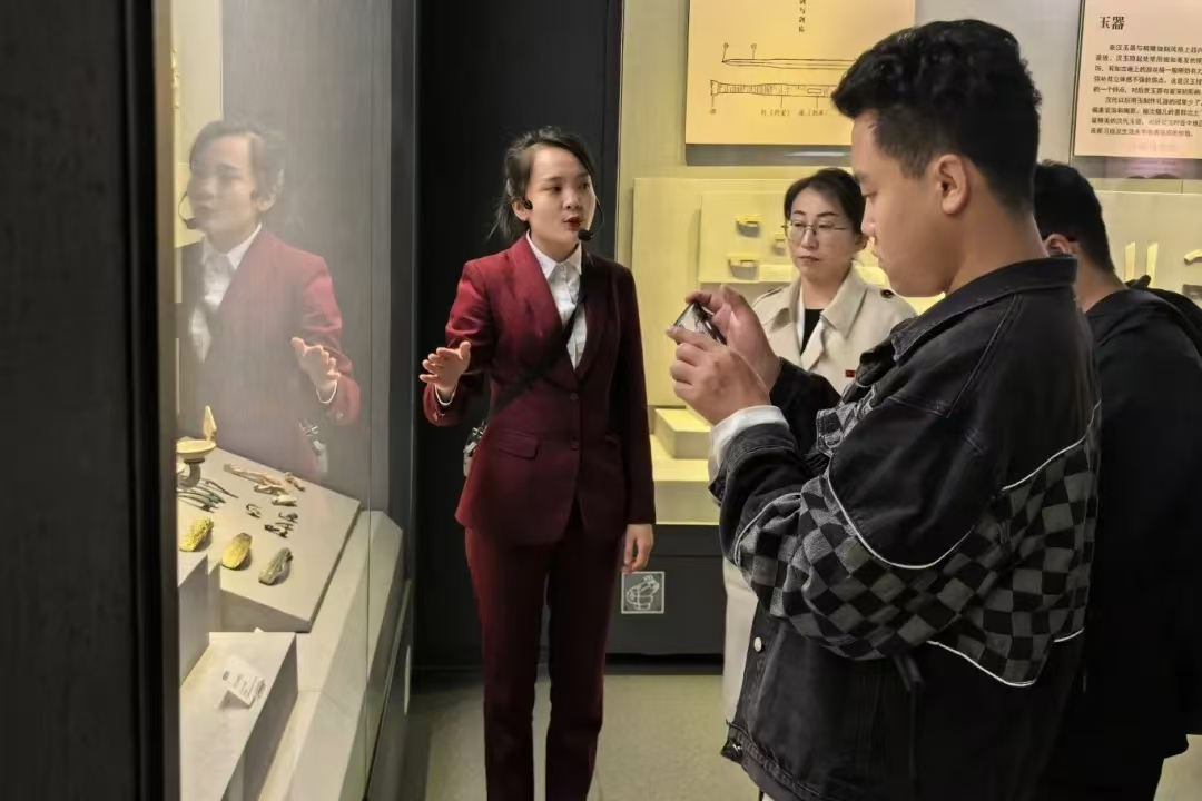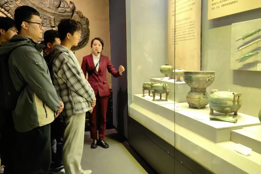上午,“行走的思政课”走进晋中市博物馆。晋中市博物馆是一座以展示和研究山西历史文化为主题的现代化场馆之一。馆内收藏了大量的文物和艺术品,包括陶瓷器、青铜器、玉器等各种类型的珍贵藏品。此外还有许多精美的瓷器和书画作品,展示了晋中地区丰富的文化遗产。灯光之下,展柜之中,一件件无言的文物沉稳地端坐,等待后来人将它们身上的历史逐一发掘。
