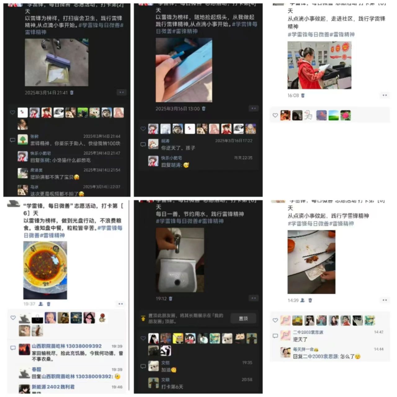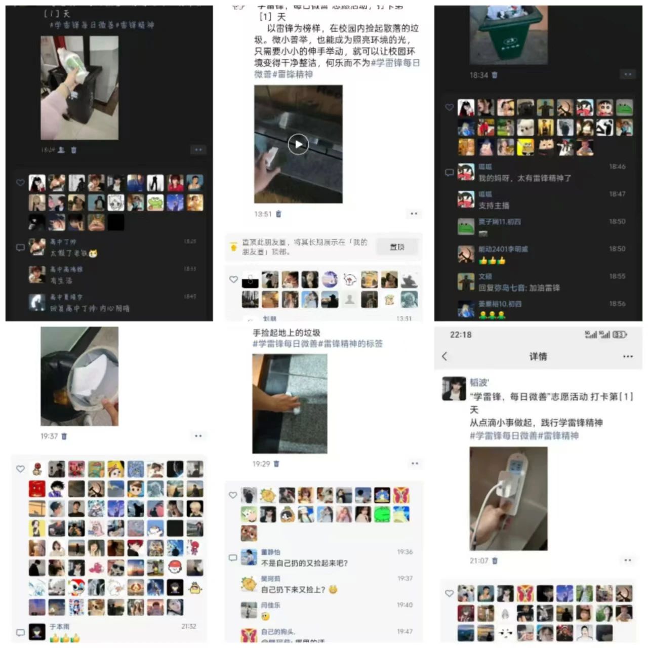 为期8天的“学雷锋,每日微善”线上打卡活动共吸引参与者近百人,学雷锋活动如春风化雨,润泽着校园内外的每一个角落。学生们的善举丰富多样,涵盖帮助他人、环保行动、捐赠物品等多个领域,有的同学帮助图书馆整理书籍,有的同学参与校园环保,还有的同学参与“青春践锋至,爱心满校园”的活动。打卡平台的互动区发挥了积极作用,学生们相互点赞、评论,分享感受心得,形成了"人人争当雷锋"的校园风尚。