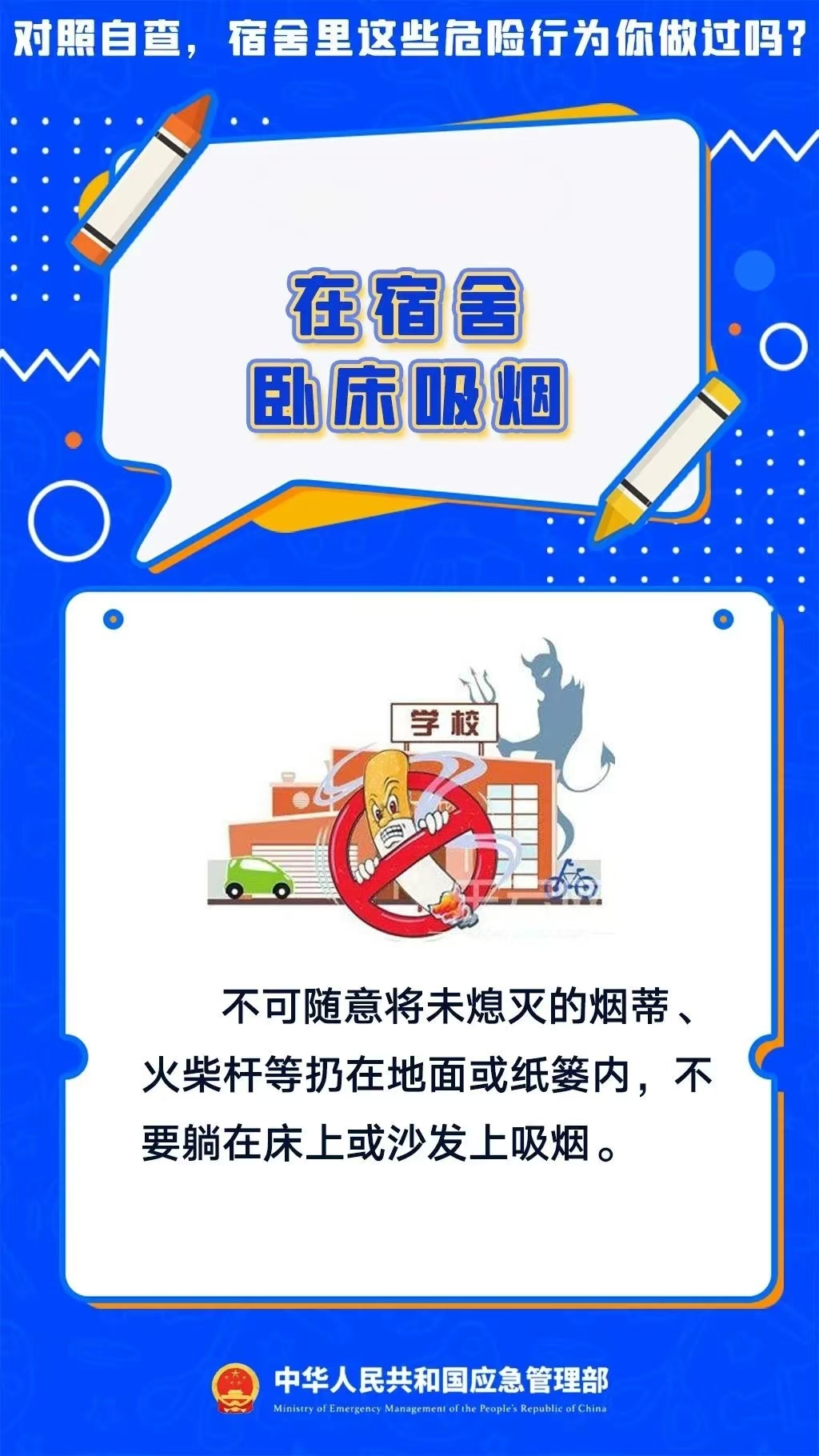 吸烟在危及同学们身体健康的同时,也严重危害寝室安全,容易引起火灾。