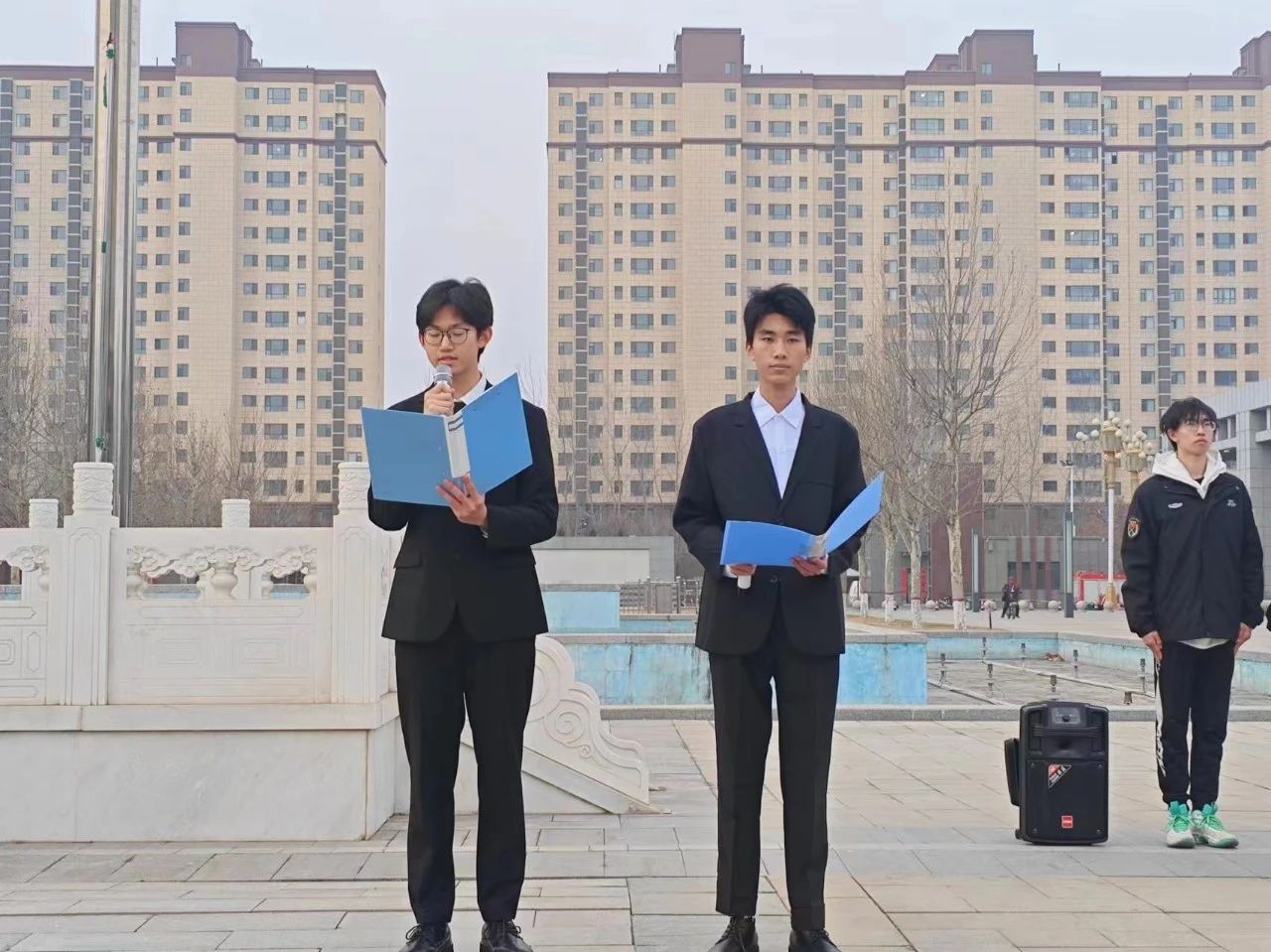 学生代表新能源22级刘勃雄发表了国旗下演讲,他演讲的主题是《聚焦两会问题,共发山能之音》。