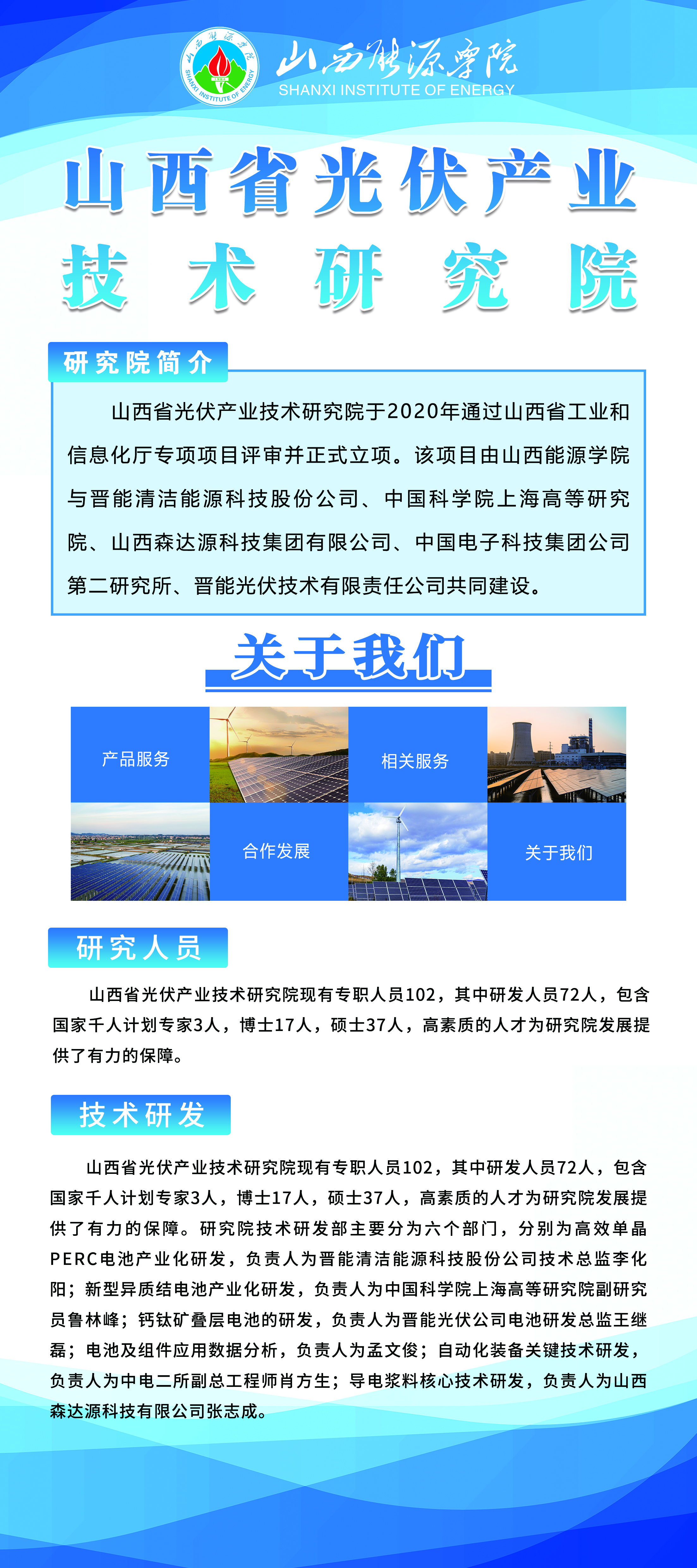 山西省光伏产业技术研究院于2020年通过山西省工业和信息化厅专项项目评审并正式立项。该项目由bat365中文官方网站与晋能清洁能源科技股份公司、中国科学院上海高等研究院、山西森达源科技集团有限公司、中国电子科技集团公司第二研究所、晋能光伏技术有限责任公司共同建设。