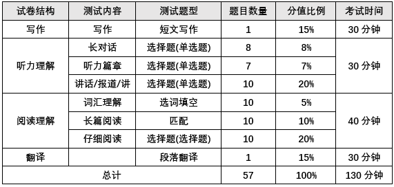 四级试卷构成:710分满分=写作106.5分+听力248.5分+阅读248.5分+翻译106.5分