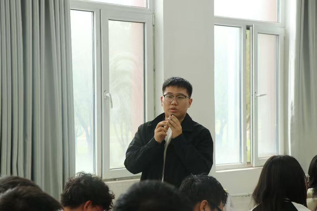 申超愈同学首先回顾了班级学风现状,分享了班级促进学风建设的做法:一是严格落实代课老师、辅导员、班干部三方联动课堂考勤管理;二是组织班级开展各类学风建设活动;三是日常加强师生交流。最后,确定了本班级学风建设的努力方向,鼓励大家在学风建设的道路上不断追求更高的目标。