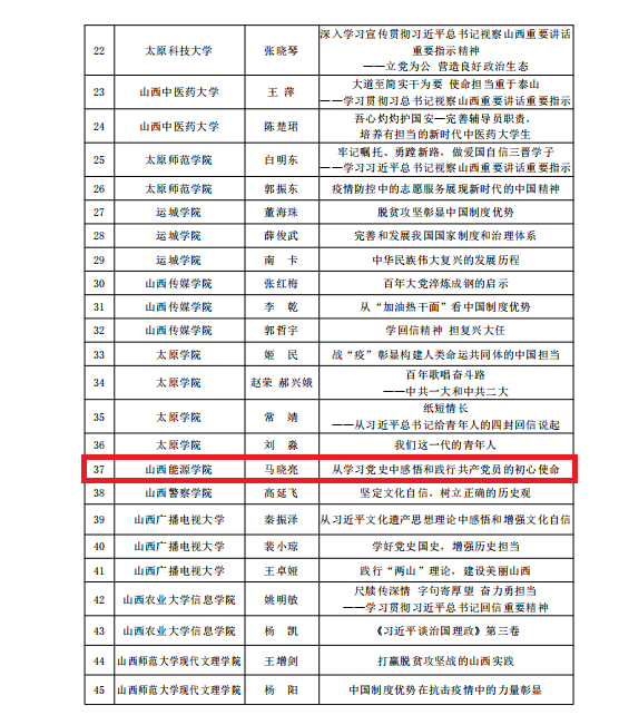 为深入推进“三团巡讲”工作,省委教育工委在全省高校开展了“三团巡讲”短视频征集活动。我院积极申报,经专家评审遴选,最终思想政治理论课教学部马晓亮老师的《从学习党史中感悟和践行共产党员的初心使命》成功入选“三团巡讲”优秀短视频名单。