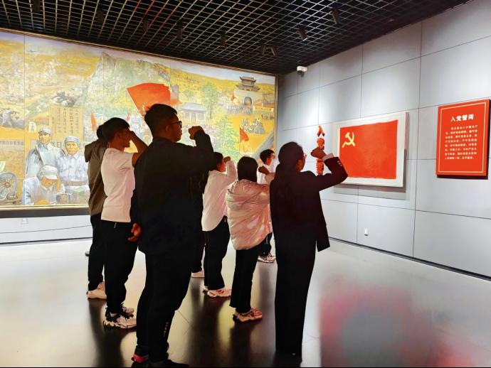 “这面特殊的党旗也在向我们、向大家、向更多的人讲述着中国共产党的历史和一代代党员的家国情怀。请党员前排就站,举起右拳,和我一起宣读誓词。”葛晨宇同学转身面向党旗,站在最前排庄严领誓。