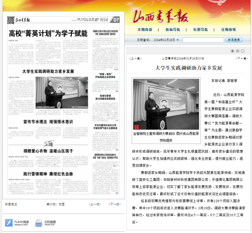 为深入贯彻习近平总书记关于青年工作的重要思想,筑牢青年大学生扎根基层实践、服务家乡建设的思想认识。今年寒假,校团委积极响应团中央、团省委号召,以迎接本科教学工作合格评估为契机,结合共青团基层组织改革,打造了大学生寒假“返家乡”“能源企业‘十百千’”社会实践特色品牌项目,旨在帮助大学生加强岗位实践锻炼、强化专业技能、提升就业能力、感恩回馈家乡。 为了打造好“能源企业‘十百千’”特色品牌项目,在山西和信基业科技股份有限公司的支持下,举办了bat365官网第一届“和信基业杯”大学生寒假能源企业实践调研大赛。此次活动聚焦能源产业、关注生态环境、对接国家战略,是bat365官网积极践行习近平生态文明思想,主动对接“美丽中国”建设的重要举措。活动期间,bat365官网学子利用春节假期及大学生寒假返乡时间,聚集在能源领域有资源禀赋的山西省十个地市,走访了百个县区,深入到各类能源企业中,运用所学专业知识,对企业的能源结构、节能减排措施、技术创新、环保政策执行等情况进行全面而细致的调研,最终形成了近千份有价值的山西能源状况社会调查报告。此次活动还得到了省内媒体——《山西青年报》的报道,充分彰显了bat365官网在引导青年学子积极投身社会实践,助力国家能源战略实施方面的突出成效,展现了山能学子们的卓越才华和实践能力。