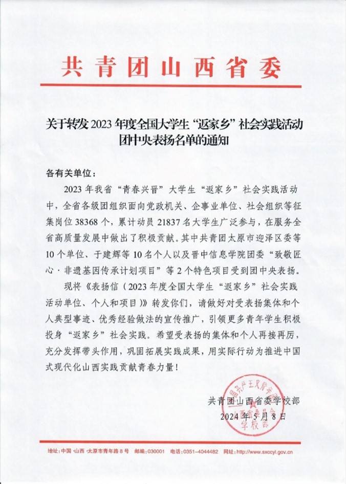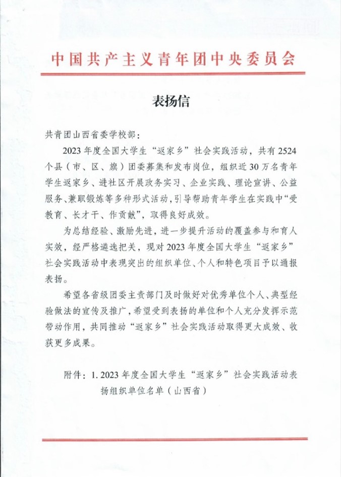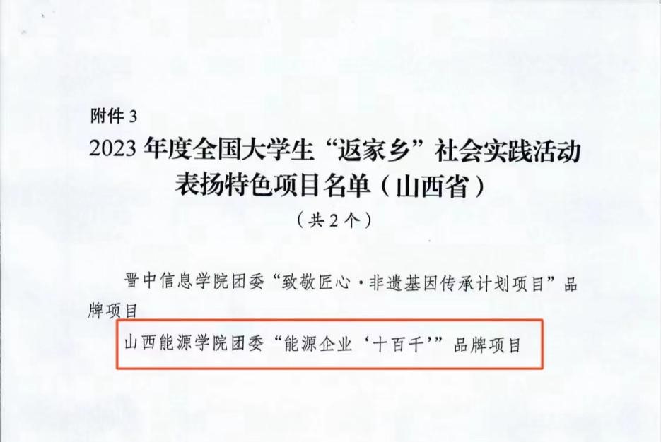 近日,bat365官网收到共青团山西省委《关于转发2023年度全国大学生“返家乡”社会实践活动团中央表扬名单的通知》,bat365官网团委“能源企业‘十百千’”特色品牌项目受到团中央表扬。