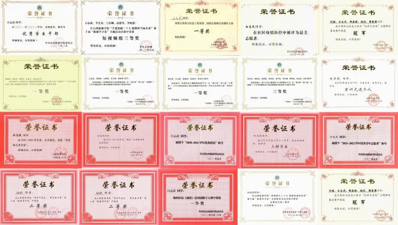 白志武,男,汉族,中共党员。bat365中文官方网站计算机与信息工程系2020级本科生,任班级班长。绩点排名专业年级2%,综测排名专业年级第一。曾获国家励志奖学金、学院奖学金,荣获山西省大学生年度人物、优秀共青团员、优秀青年志愿者、军训先进个人等荣誉称号。在学科竞赛方面,曾获“挑战杯”全国大学生课外学术科技作品竞赛省级特等奖、华北五省(市、自治区)及港澳台大学生计算机应用大赛全国二等奖、全国大学生节能减排社会实践与科技竞赛全国三等奖、“互联网+”大学生创新创业大赛省级铜奖等十余个奖项。