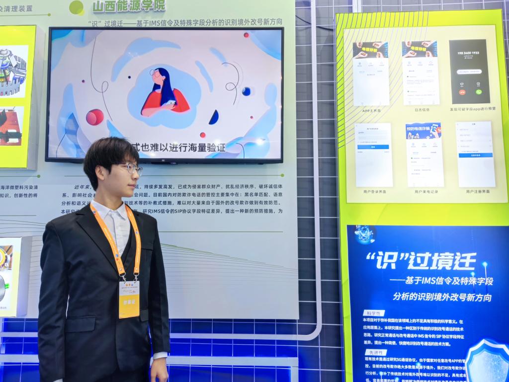 bat365官网学子通过展板与LED屏对项目进行讲解,向参展人员展示“山能防诈骗App”的经济价值和社会效益。