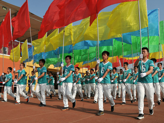 4月27日上午,伴着雄壮激越的运动员进行曲,入场式开始,主席台前先后走来了国旗方队、彩旗方队、表演方队和裁判员方队,紧随其后的是服装整齐、步伐有力的11支参赛代表队。他们精神饱满,口号嘹亮,展现了积极饱满的精神状态和昂扬的斗志,赢得了全体师生的阵阵喝彩。随后,大会举行了升国旗仪式。