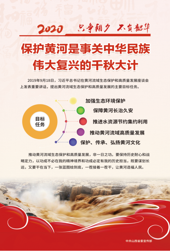 2019年8月18日,习近平总书记在黄河流域生态保护和高质量发展座谈会上发表重要讲话,提出黄河流域生态保护和高质量发展的主要目标任务:加强生态环境保护、保障黄河长治久安、推进水资源节约集约利用、推动黄河流域高质量发展和保护、传承、弘扬黄河文化。