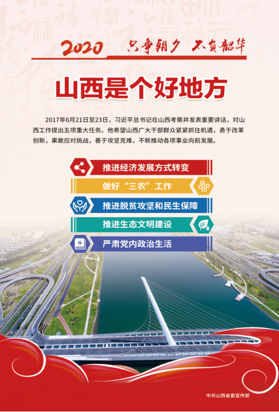 2017年6月21日至23日,习近平总书记在山西考察并发表重要讲话,对山西工作提出五项重大任务:推进经济发展方式转变、做好“三农”工作、推进脱贫攻坚和民生保障、推进生态文明建设、严肃党内政治生活。他希望山西广大干部群众紧紧抓住机遇,勇于改革创新,果断应对挑战,善于攻坚克难,不断推动各项事业向前发展。