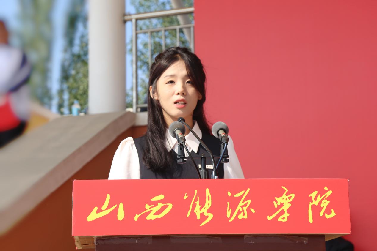 资源与环境工程系能环2102班的靳璐瑶作为在校代表发言。她介绍了自己两年来在学校的感受,鼓励学弟学妹们要有“不从众不移志”的坚定信念、“倾全力用全心”的奋斗精神、“成大才担大任”的使命情怀。早日成长为国家能源革命需要的高素质人才,成长为社会主义事业合格的建设者和接班人。
