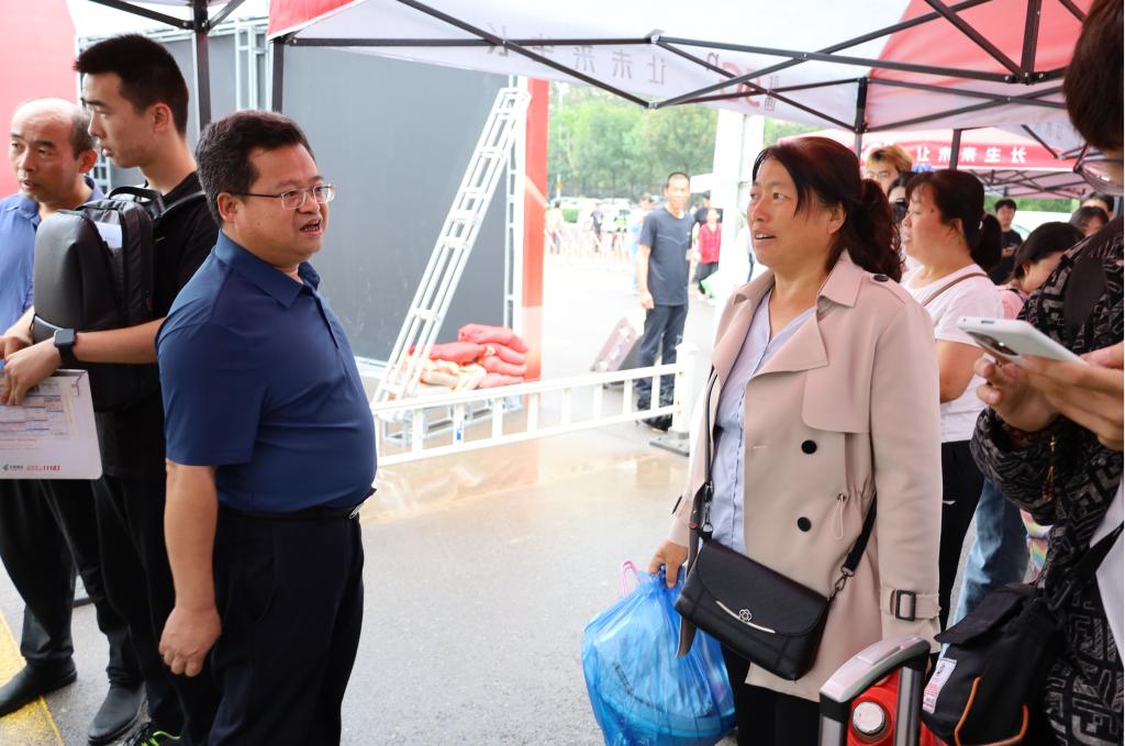 校领导一行从学校南门出发,沿新生报到的路线,逐一检查迎新各环节。首先来到学校门口,热情迎接报到入学的新生,对迎新场地布置、校外交通秩序与新生入校引导工作进行了检查,并通过智慧屏幕了解生源信息与报到实时情况。