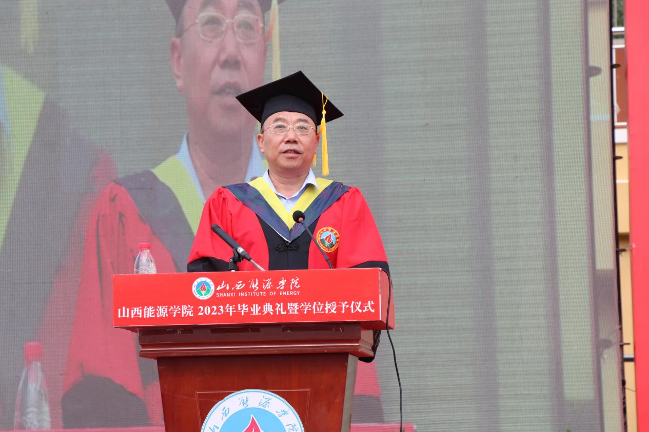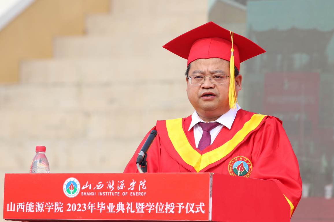 典礼上,党委副书记、院长冯国瑞教授发表了《青春无边 奋斗以成 不负新时代 扬帆新征程 强能新启航》的讲话。冯国瑞院长代表学校和全体师生向圆满完成学业、即将奔赴人生新征程的毕业生,表示了热烈的祝贺和诚挚的祝福!他提到,学校正处于发展上升期和战略机遇期,这是我们所有人砥砺奋进的成果。他满怀深情,与大家一同回顾了2023届毕业生孜孜不倦追求真知、脚踏实地投身实践的大学生活。他讲到,一代人有一代人的际遇,一代青年有一代青年的使命。2023届毕业生不仅在校见证了新中国成立70周年、中国共产党成立100周年、党的二十大胜利召开等伟大历史时刻,还经历了三年疫情全过程,与学校同舟共济、共克时艰,为抗击疫情的胜利做出了巨大贡献,这段历史也将成为山能校史中最浓墨重彩的一章。讲话中,冯国瑞院长勉励即将远行的毕业生树报国之志,为强国建设和民族复兴彰显青春使命;尽担当之责,在能源革命和经济转型的大潮中建功立业;扬创新之帆,努力推动国家发展和社会变革。冯院长在讲话中祝福同学们壮志在胸、理想在怀,一路高歌,前程似锦!