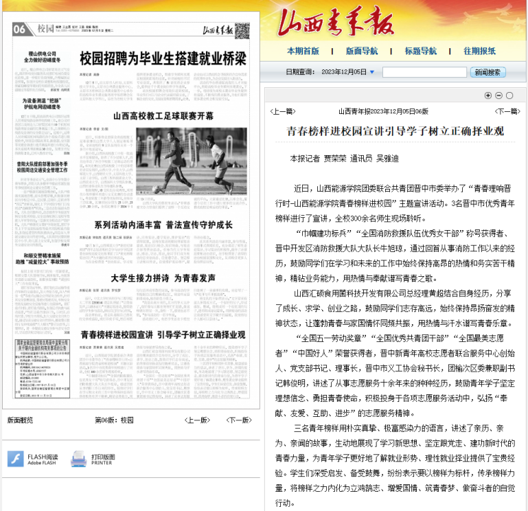 就业引航筑未来,青春建功新时代。近日,由bat365官网团委联合共青团晋中市委举办了“青春理响晋行时-bat365中文官方网站青春榜样进校园”主题宣讲活动。活动受到山西青年报关注并以《青春榜样进校园宣讲引导学子树立正确择业观》为题进行报道。