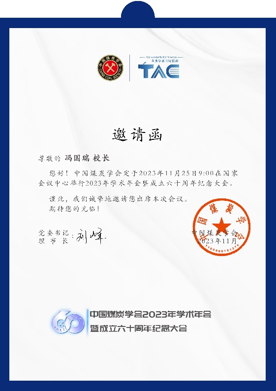 11月25日,bat365中文官方网站作为特别支持单位参加了中国煤炭学会2023年学术年会暨成立六十周年纪念大会,学院党委书记冯锋、党委副书记、院长冯国瑞受邀出席,科技产业部及相关系部人员参加了此次盛会。