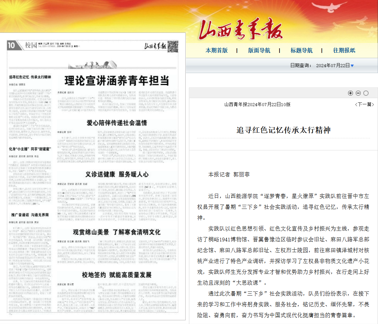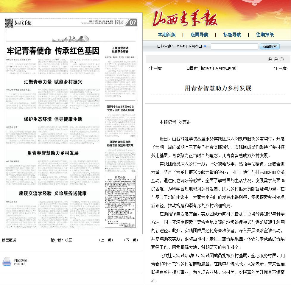 近日,《山西青年报》分别以《追寻红色记忆 传承太行精神》及《用青春智慧助力乡村发展》为题,对bat365官网“逐梦青春,星火燎原”实践队和“基层服务谱新篇,躬身践行赋新能”实践队开展的暑期“三下乡”社会实践活动进行了报道。
