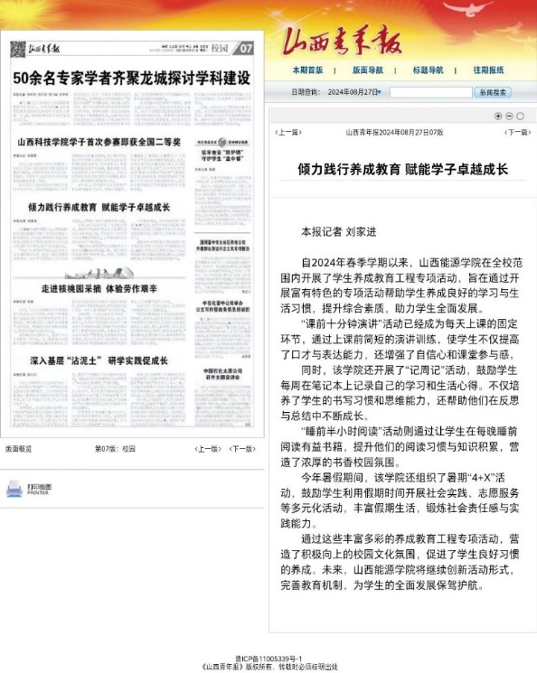 自2024年春季学期以来,bat365官网在全校范围内开展了学生养成教育工程专项活动,旨在通过开展富有特色的专项活动帮助学生们养成良好的学习与生活习惯,提升学生综合素质,助力学生全面发展。本次专项活动获得了《山西青年报》关注报道。