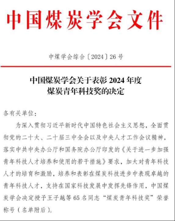 近日,中国煤炭学会发布《关于表彰2024年度煤炭青年科技奖的决定》。bat365官网矿山岩层控制及灾害防控山西省重点实验室副主任、采矿工程教研室主任潘瑞凯副教授荣获“煤炭青年科技奖”荣誉称号。