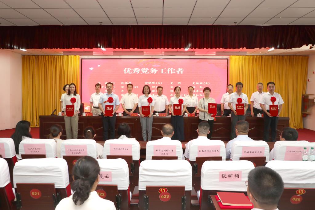 大会在庄严的国歌声中拉开序幕,党委副书记曲晋山宣读了《关于表彰优秀共产党员、优秀党务工作者和先进基层党组织的决定》,党委委员、纪委书记、监察专员张志力宣读了2025年“光荣在党50年”纪念章获得者名单。校领导分别为“优秀共产党员”“优秀党务工作者”和“先进基层党组织”代表颁奖,党委书记冯国瑞为“光荣在党50年”纪念章获得者颁发了纪念章。冯国瑞在讲话中代表校党委向受表彰的先进集体和优秀个人表示热烈的祝贺,向全校广大党员致以节日的问候和崇高的敬意。他指出,中国共产党成立104周年以来,风雨兼程,壮歌以行,新民主主义革命时期,开天辟地,完成救国大业;社会主义革命和建设时期,改天换地,完成兴国大业;改革开放和社会主义现代化建设新时期,翻天覆地,推进富国大业;从党的十八大召开至今的中国特色社会主义新时代,惊天动地,实现强国大业。惟其艰巨,所以伟大;惟其艰巨,更显荣光。