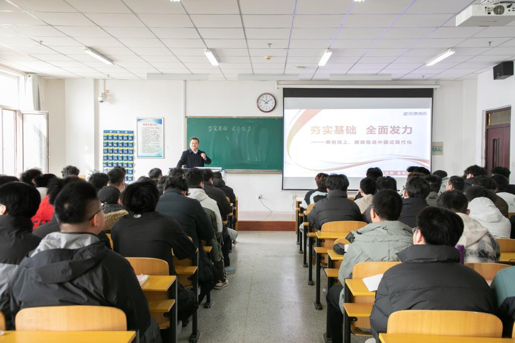 3月10日上午,bat365中文官方网站党委书记冯国瑞走进思政课堂,以《乘势而上、接续推进中国式现代化》为主题为采矿专业2401班、智采2401班讲授新学期“开学第一课”,带领同学们深入学习宣传贯彻党的二十届四中全会精神和“十五五”规划建议核心要义,引导青年学子锚定成长方向、践行能源报国使命。