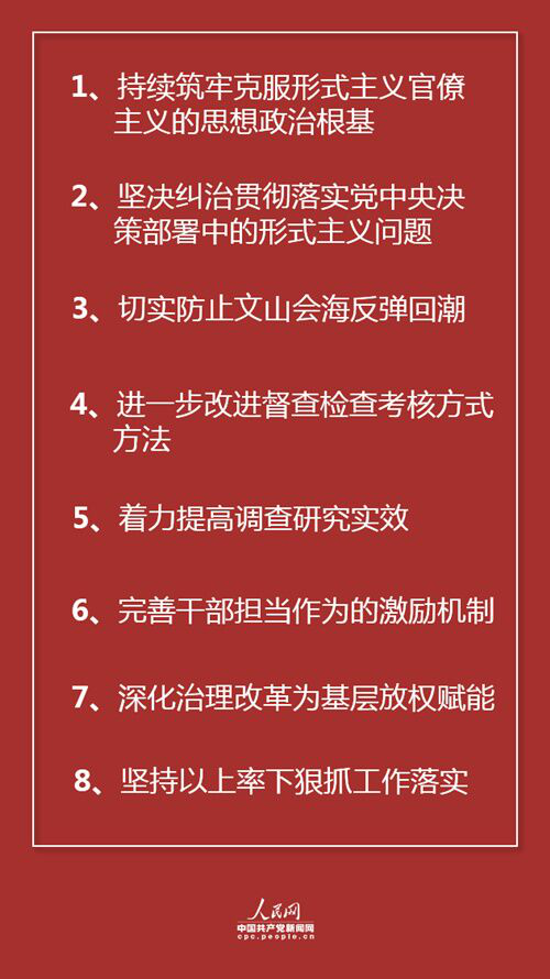 对此,《通知》坚持问题导向、目标导向、结果导向相结合,坚持标准不降、力度不减,精准施治、靶向治疗,加强源头治理和制度建设,提出八方面要求:持续筑牢克服形式主义官僚主义的思想政治根基;坚决纠治贯彻落实党中央决策部署中的形式主义问题;切实防止文山会海反弹回潮;进一步改进督查检查考核方式方法;着力提高调查研究实效;完善干部担当作为的激励机制;深化治理改革为基层放权赋能;坚持以上率下狠抓工作落实。
